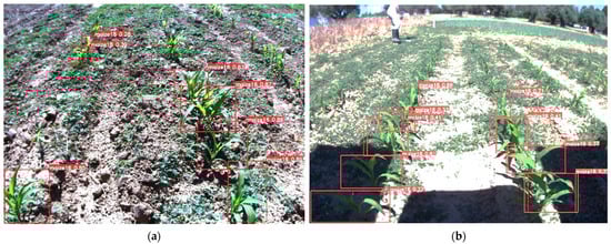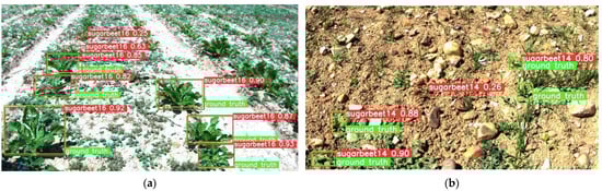 Detection (red) vs. ground truth (green) example. The model detections are highlighted in red, identifying the crop and confidence of the detection. The initial annotations for training are highlighted in green. (a) Example of correct detections of sugar beet plants that were not initially labeled. (b) Example of a case of incorrect detection of weeds as sugar beet plants with a confidence of 0.26.