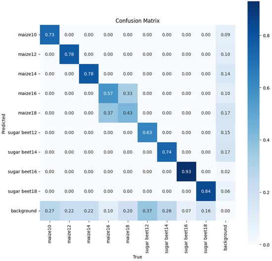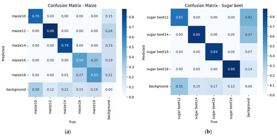 In the initial phase, images for both crop types were used to train a two-class model with YOLO v5. In this phase, crop type classification is the primary focus. This model achieved an overall mAP of 74.2%, with an individual sugar beet mAP of 70.8% and a higher one for maize of about 77.6% (Table 5). While detection accuracy is vital, equal emphasis is placed on discerning false positives and misclassifications. The confusion matrix (Figure 5a) is a crucial tool in this context, revealing the extent to which one class has been misidentified as another. Notably, no instances were misclassified as the wrong crop, although some previously unlabeled plants were identified. The confusion matrix in object detection has a class called background; this class identifies parts of the image that have not been labeled. A background prediction but an actual maize scenario means that the model failed to identify a maize plant that was present in the image. A background truth case is one where the model detected an object as maize or sugar beet, but the object was not labeled as either of these crops in the ground truth. These detections may be correct in the proposed dataset, as the dataset only labels plants closest to the camera (Figure 6a). However, given the agricultural context where the environment contains the target crops alongside soil and weed varieties, there is a possibility that some weeds that are not part of the study’s focal crops might be misidentified as one of the crops under investigation (Figure 6b).
