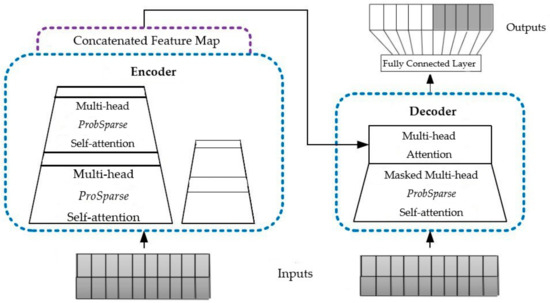Although Transformer can predict long time sequences and demonstrates strong prediction ability, the model’s multilayered encoder–decoder structure means that the longer the sequence, the slower the speed, and the worse the effect of the model in predicting long time sequences [47]. Herein, we address this issue and the inherent issues with the encoder–decoder architecture by introducing an effective LSTM model based on an improved Transformer, the Informer model. This model uses probabilistic sparsity inside the encoder—a self-attention mechanism—trained and learned according to sequences with high probability in the data and filtering the Q-value with high weight [48]. As a result, the complexity may be significantly reduced. Figure 3 presents the structure of this model.