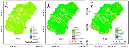 Land use type change map for 2000, 2010, and 2020.