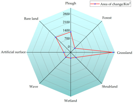 As illustrated in Figure 4, the land use categories for the Maowusu Sandland from 2000 to 2020 were plow, woodland, grassland, shrubland, wetland, wave, bare land, and man-made surface, in sequence. In the research area, the categories of land use include, in decreasing order, grassland, bare land, farmland, shrubland, water body, wetland, man-made land surface, and forest. Grassland, bare land, and plow all exhibited an upward tendency between 2000 and 2020, with grassland showing the largest increase, wave exhibited the slightest increase, and wetland and forest remaining relatively unchanged.