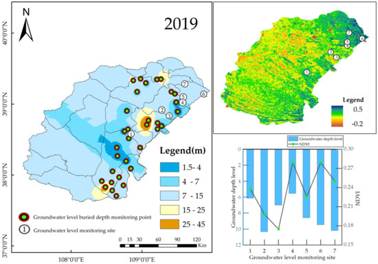 The Ordos Hydrological Bureau, located in China’s Inner Mongolia Autonomous Region, supplied all information on burial depths and groundwater levels. Within the spectrum of places with data recordings, the 2019 groundwater level depth in the Maowusu Sandland exhibited more pronounced variances, as illustrated in Figure 6. In the research area, the depth of the groundwater varied widely, with shallow depths in the middle and northern areas and depths below 10 m in the northern and southern regions. According to the 2019 NDVI spatial distribution map of the Maowusu Sandland, this area had a wide range of variable groundwater depths. We discovered that vegetation was well-developed in areas with shallow groundwater table burial depths, which suggests that groundwater had a beneficial promoting effect on vegetation. However, most places had groundwater buried deeper than 7 m, and the relationship between groundwater and vegetation was weak.