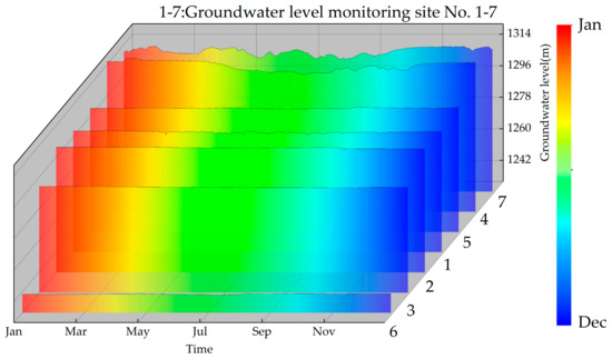 Our daily monitoring of the Maowusu Sandland groundwater level changes in 2019 revealed that only points 4 and 7 had more obvious variations in groundwater level (Figure 7). This was largely because these points are situated in an area of cultivated land, where the groundwater is primarily used for irrigation water for agricultural development and where the groundwater level is buried deeper.