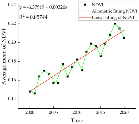 The Maowusu Sandland’s average Sen slope value from 2000 to 2019 was 0.18, and its slope was 0.0034 a−1, showing that the NDVI increased steadily while growing at a relatively modest rate (Figure 8). Most of the quicksand regions were located in the hinterland of the sandy land, which contributed to the study area’s low vegetation cover in 2000. Most of these areas had <30% vegetation cover. The Maowusu Sandland has undergone construction and ecological protection projects in recent years from national and local governments, which have improved the ecological environment and increased the plant cover, although the geographical disparity is still evident [49].