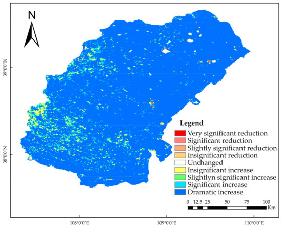 The change in vegetation cover was divided into nine classes based on the Theil-Sen Median trend value analysis and the Mann–Kendall nonparametric test at a significance level of 0.05: dramatic increase, significant increase, slightly significant increase, insignificant increase, unchanged, insignificant reduction, slightly significant reduction, significant reduction, and very significant reduction.