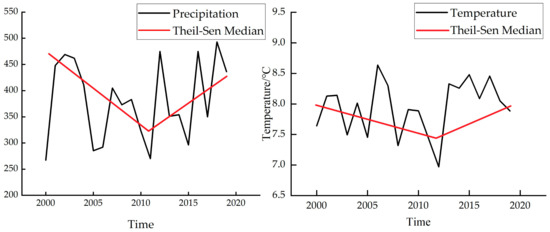 In the study area, the temperature and precipitation change rates showed substantial declining trends between 2000 and 2010 (Figure 11). This suggests that the environment was drier, which was detrimental to the growth and recovery of vegetation. Meanwhile, the rates of temperature and precipitation changes showed substantial upward trends from 2013 to 2019 (Figure 11). During the 2011 to 2013 period, the temperature decreased, and the quantity of precipitation increased. The humid weather created ideal circumstances for the NDVI to thrive.