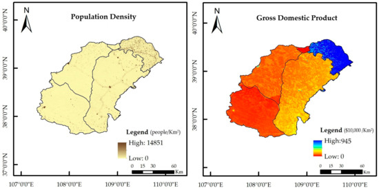 In terms of population density and gross domestic product (GDP) in the study area in 2020 (Figure 14), the population was primarily distributed in the region of vegetation cover NDVI growth, with the high human living standard also located in this region. This is primarily because ecological restoration work in urban suburbs supports development. In contrast, the desert area has a small population and a low human living standard, making the area difficult to develop.