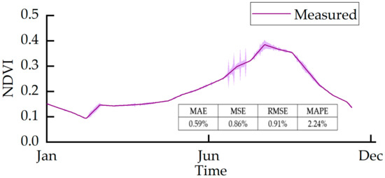 Figure 16 shows that the prediction error values of the Informer model’s findings compared to the actual results are 0.59%, 0.86%, 0.91%, and 2.24% for mean absolute error (MAE), mean square error (MSE), root mean square error (RMSE), and mean absolute percentage error (MAPE), respectively. This provides strong evidence that our enhanced Transformer-based Informer model closely approximates the real values’ curve fit. Our prediction model will have a lower error value and use less computation time than the conventional model, thoroughly demonstrating the viability of the model. As a result, the model is more effective in forecasting NDVI’s future trends.