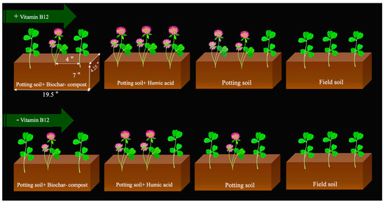Schematic drawing of the experiment setup. The upper row shows pots that received vitamin B12 and the lower row demonstrates pots with no vitamin B12. The amount of enriched biochar and humic acid is the same in both.