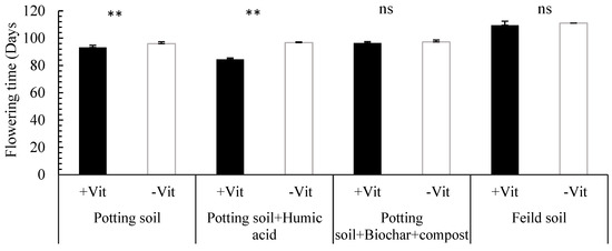 Interactive effect of vitamin B12 and growing media on flowering time. Clovers were grown in potting soil alone or amended (by either humic acid or enriched biochar and field soil). All pots were grown either with or without vitamin B12. The presented values are an average of 4 replications and three biological observations. ** indicates highly significant differences (p ≤ 0.01), ns indicates non-significant differences, and error bars indicate standard deviations.