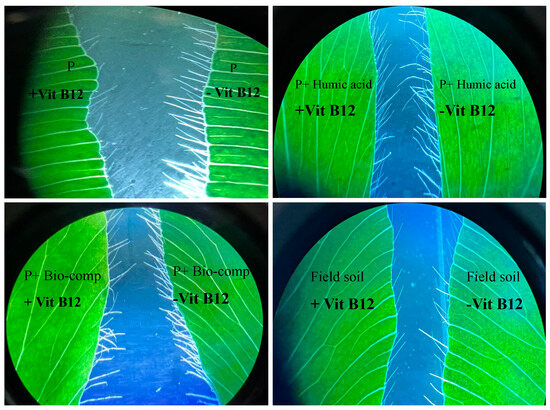 Stereomicroscopic image of trichome density and thickness in the leaf margin of red clover that received two levels of vitamin B12: +Vit = vitamin B12; −VitB12 = without Vitamin B12 in different growing media; P: potting soil; P + Humic acid: potting soil + humic acid; P + Bio + comp: potting soil + biochar enriched with compost and field soil.