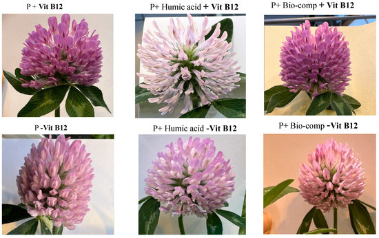 Vitamin B12 also influenced the cluster and the pigmentation (color) of the clover flowers grown in the potting soil + humic acid growing media so that the flowers bloomed with less-dense clusters and a pale pink color (Figure 4).