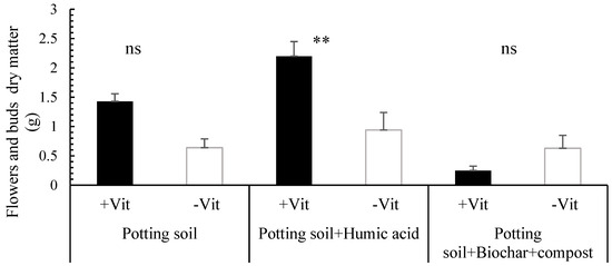 Interactive effect of vitamin B12 and growing media on bud and flower dry matter. Clovers were grown in potting soil alone or amended (by either humic acid or enriched biochar) and field soil. All pots were grown either with or without vitamin B12. The presented values are an average of four replications and three biological observations. ** Indicates highly significant differences (p ≤ 0.05); ns indicates a non-significant difference; and error bars indicate standard deviations.