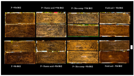 Root appearance in plants that received two levels of vitamin B12: +Vit = vitamin B12; −VitB12 = without Vitamin B12 in different growing media: P: potting soil; P + Humic acid: potting soil + humic acid; P + Bio-comp: potting soil + biochar + compost and field soil.