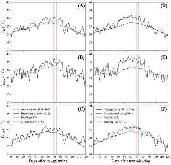 Daily mean air temperature (A,D), maximum air temperature (B,E), and minimum air temperature (C,F) at the experimental site in 2016 (A–C) and in 2018 (D–F). The average values for 1981–2010 are shown in each panel. Vertical red and blue lines indicate the heading date at AT and at AT + 3 °C, respectively.