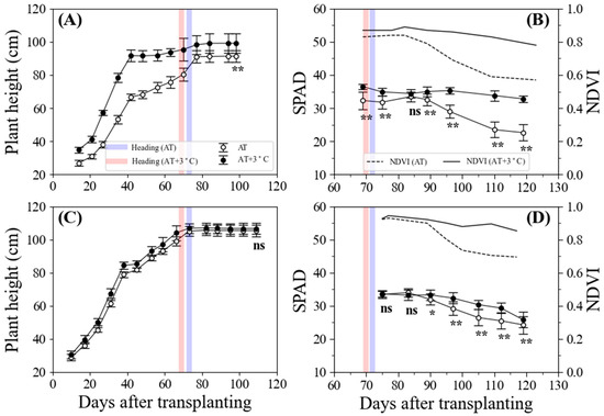 Plant height (cm; (A,C)), SPAD value, and normalized difference vegetation index (NDVI; (B,D)) under two temperature regimes in 2016 (A,B) and 2018 (C,D). Vertical red and blue lines indicate the heading dates under AT and AT + 3 °C, respectively. Error bars represent standard deviation; n = 10 and n = 20 for plant height and SPAD, respectively. Significance was assessed using independent two-sample t-tests: **, p < 0.01; *, p < 0.05; ns, not significant (p ≥ 0.05).
