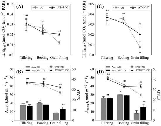 Light-use efficiency (LUE), SPAD values, and maximum photosynthetic rate (Amax) under AT and AT + 3 °C at the tillering, booting, and late grain filling stages in 2016 (A,B) and in 2018 (C,D). Error bars represent standard deviation; n = 3. Significance was assessed using independent two-sample t-tests: **, p < 0.01; *, p < 0.05; ns, not significant (p ≥ 0.05).