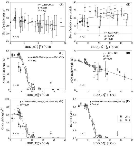 Relationship between the (A) no. of panicles per m2, (B) no. of spikelets per panicle, (C) grain filling rate, (D) 1000-grain weight, (E) grain yield, and (F) harvest index and the heating degree day (HDD) during specific growing periods: the early growth period ((A); from 5 days after to 50 days after transplanting), the late growth period ((B); from 35 days to 5 days before heading), and from heading to maturity (C–F). Error bars represent standard deviation.