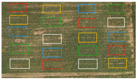 Import the gathered multispectral images into Pix4D Mapper software (from Pix4D, V4.4.12, Lausanne, Switzerland) for preprocessing to derive the reflectance spectrum of summer corn within the sampling point ROI region (illustrated as the box in Figure 2). The primary steps encompass (1) ortho-image processing; (2) calibration using reflectance board DN values, generating stitched images; (3) geometric correction with concurrently obtained high-definition digital images as references; (4) choosing the necessary ROI region pertinent to this study; (5) deriving the average reflectance spectrum within the ROI, representing the summer corn’s reflectance spectrum within that specific ROI region. For this study, 20 experimental ROI regions, each measuring 10 m × 5 m, are chosen based on growth gradients. Of the data, 70% is designated as the training set (70 plants of maize), while the remaining 30% forms the validation set (30 plants of maize).