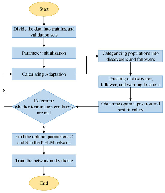 Kernel-based extreme learning machine (KELM) is an improved algorithm based on ELM, and combined with the kernel function, KELM guarantees good generalization ability and faster learning speed based on retaining the advantages of ELM to improve the prediction performance of the model [35]. The predictive performance of KELM is significantly influenced by the regularization coefficient C and kernel function parameter S. Inadequate parameter optimization ability and poor local search capabilities can result in convergence on local optima, leading to low prediction accuracy. The SSA-KELM model optimizes the regularization coefficient C and kernel function parameter S using the sparrow search algorithm, enhancing the model’s predictive capability. To further select the regularization coefficient C and kernel function parameter S, the fitness function is designed as the training set’s mean squared error (MSE):