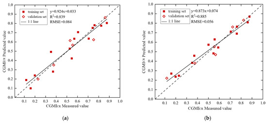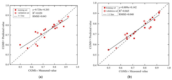Relationship between predicted and measured values of the CGMICV models based on PLSR and SSA-KELM: (a) PLSR-CGMICV predictive model; (b) SSA-KELM-CGMICV predictive model.