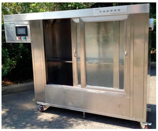 Test equipment: 3WP-2000 Bioassay Spray Tower (developed by Nanjing Institute of Agricultural Mechanization, Ministry of Agriculture and Rural Affairs). The spray time can be set at will and the corn was placed on the sample plate in the tower. The distance between the sample plate and the nozzle was 250–750 mm adjustable. After the door of the tower is closed, the environment inside the tower will not be affected by external airflow and other factors, as shown in Figure 2.