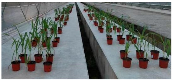 Object: potted corn, variety Suyu 39 (Biocentury Transgene (China) Co., Ltd., Shenzhen, China). The greenhouse pot culture method was used to cultivate corn. Sifted air-dried sandy loam with 4% organic matter content, neutral (PH6.0~8.0), and good permeability was put into a 9 cm diameter plastic culture basin, and the dry soil quantity was 4/5. After the soil was fully moistened by osmotic irrigation at the bottom of the bowl, the corn seeds with white buds were evenly spread on the surface of the soil, 2–3 seeds per pot, and the soil was covered by 0.5~2.0 cm. The seedlings were thinned in the period of 1~2 leaves, and 1 corn plant was kept in each pot. The cultivation amount of corn plants was twice as much as the test amount in order to select the corn plants with similar or the same height for the test, as shown in Figure 1.