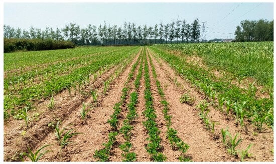 As important crops in China, corn and soybean are multipurpose crops for grain, oil, feed, and processing raw materials and have been planted for hundreds of years in China [,]. In recent years, soybean–corn intercropping has been widely promoted in China. This planting mode can not only improve the yield of corn and soybean, but can also increase land coverage, improve soil fertility, and enhance the stability of the farmland ecosystem [,]. It has played a vital role in ensuring China’s food security and revitalizing the corn and soybean industries.