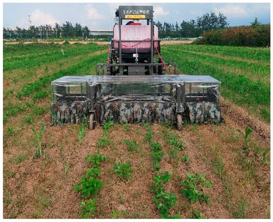 Farmland weeds refer to plants that grow in the farmland and are not purposefully cultivated by humans. They run through the whole growth period of crops, and are usually a composite population composed of a variety of annual gramineous or broadleaf weeds [,]. There are many kinds of weeds with a strong ability to spread and long damage time under soybean–corn intercropping. They compete with corn and soybean for nutrients and light and will directly affect the yield and quality of corn and soybean without proper control []. As one of the measures to save labor and time and achieve considerable control effect, chemical controls have been applied in soybean–corn intercropping []. However, the problem of herbicide drift has been widely found since the first use of chemical weeding [,]. The row spacings of corn and soybean under intercropping are narrower than those under the single planting mode, so herbicides are more likely to drift to adjacent crops to cause herbicide damage, which may pose a great threat to the growth of crops [,].