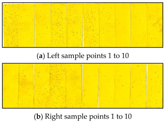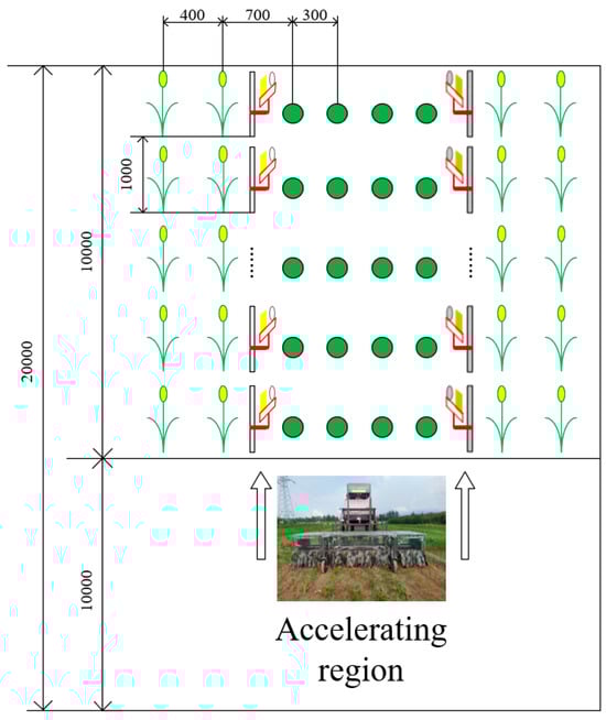 The width of the sampling area was set at 4 soybean rows + 2 corn rows and the length of one route was 115 m. Considering not to cause serious damage to the corn, we only verified the herbicide damage under low drift deposition rate. The spray volume was selected as 450 L/ha, and the machine was equipped with anti-drift nozzle LANAO FP 90-03, driving speed of 1 m/s, and spray pressure of 3 bar. We chose a soybean–corn compound planting row 10 m away from the field ridge because this row was the neatest and most uniformly planted when compared. Single driving distance was set to 20 m and the first 10 m was the acceleration region of the machine, and the last 10 m was the sampling area where the sprayer sprayed the soybean rows with quizalofop-p-ethyl herbicide, which may drift and deposit on the corn. Spraying with only the nozzles above the soybean rows was turned on, and water-sensitive paper and polyester disks were arranged on the outside of the corn row in the two rows adjacent to the soybeans. The water-sensitive paper was used to observe whether there was droplet drift and the polyester disks were used to collect the drift droplet. The samples on the left side of the forward direction of the machine were named left 1–left 10, and on the right side of the forward direction were named right 1–right 10. The height of samples was equal to the height of the corn, and the sampling was repeated three times on a single route, as shown in Figure 6.