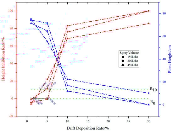 Effects of spray volume and drift deposition rate on corn plant height and inhibition rate.