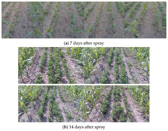 The growth of corn at all sampling points 7 days and 14 days after spray is shown in Figure 9, and there was no symptom of herbicide damage under a 1.22~1.69% drift deposition rate, which is similar to the result of no symptoms of herbicide damage in potted corn tests under a 1% drift deposition rate. It can also be seen from the figure that there was almost no weed growth between the soybean rows, indicating that this herbicide was used with good results.