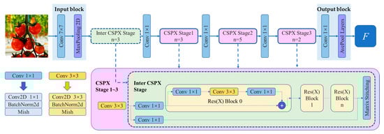 Considering that the images collected have different pixel sizes and data storage formats, including jpg, png, and tif, these factors should be fully considered before designing the input module of the entire model. Thereby, the input block contains a convolutional kernel of 7 × 7 with a step size of 2, and a maximum pooling layer with a kernel of 2 × 2, of which step size is 2. It then passes through the inter CSPX stage consisting of n partial residual blocks and a partial transition layer. The feature maps of the base layer in the inter CSPX stage are split into two parallel paths. Path b first passes through a convolutional layer with a convolutional kernel of 1 × 1 and a step of 1, and then passes through several residual blocks, which can be either ResNet or ResNeXt. The input of path 2 is directly summed with the result of path 1 to obtain the output of path b. Path c similarly goes through a convolutional kernel of 1 × 1 with a step size of 1 and an output of 64 channels, which is then spliced directly with the output of path b and goes through a convolutional kernel of 1 × 1 to obtain an output of 256 channels. The dimensions of all outputs will be doubled. The formulae in each CSPX stage are shown below: