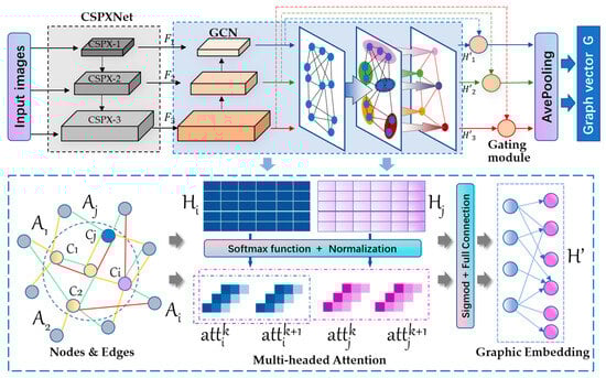 At the same time, another procedure aims to complete the graphical embedding for the contextual learning of massive discrimination parts. After transforming the middle features of CSPX stage 1~3 into higher-order graph features, self-attention is subsequently introduced to embed the association information between the target node and all neighbor nodes. In order to effectively assign weights among each node, function combined with normalization is utilized to calculate the attention correlation coefficient between the i-th and j-th nodes as follows: