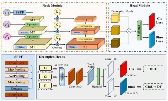 In order to enhance the detector’s focus on fine-grained features, we introduced a new attention mechanism by effectively merging bi-level routing attention (BRA) [59] with ghost convolution, namely BRGAtt, offering better global context perception. The primary objective of the self-attention mechanism is to enhance the network’s concentration on pivotal areas. Unlike other attention modules, the BRGAtt module is designed with the query-aware sparse concept, aiming to select the relevant key-value pairs according to each query. This module starts with exploiting the least pertinent key-value pairs at the area level, thereby retaining less numerous routing regions. Subsequently, fine-grained label-to-label attention is employed to prompt these routing regions. After some matrix multiplication and ghost convolutions, BRGAtt has achieved the global perceptual performance while ensuring high computational efficiency, as show in Figure 5.