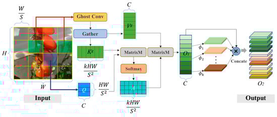 Considering that the dense, small targets often congregate within specific areas of agricultural vision, it is necessary to generate more attention maps with fewer parameters to further strengthen the detector’s focus on fine-grained features. So, we introduce the ghost convolution operation through a small number of linear transformations and depth-wise conventional layers, thereby effectively reducing the computational consumption while ensuring the model’s performance. After this process, the BRGAtt module can eliminate the channels that interfere with each other so that they obtain a more comprehensive representation of the fine-grained information, leading to improved performance in small-scale object detection. The updated expression of output vector is as follows:
