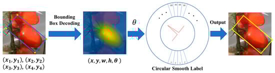 where represents the original label, and denotes the window function with a controlled radius r. This radius determines the angle of the current bounding box. Consequently, as the predicted and true values become closer within a certain range, the loss value decreases. Moreover, we address the issue of angular periodicity by incorporating periodicity, whereby angles like −90 degrees and 89 degrees are considered neighbors, which exhibits higher tolerance to adjacent angles. The regression process for rotating bounding boxes with circular smooth labels is illustrated in Figure 6.