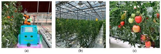 The collection of the experimental dataset in this study was carried out in the Beijing Chaolai Agronomic Garden. As shown in Figure 7a, considering the engineering applicability of the algorithm, we placed some cameras (device type: Intel RealSense D435i camera) on the picking robot to collect the crop image dataset and verify model performance. As shown in Figure 7b, the row spacing in the greenhouse was 1.9 m, the spacing between adjacent plants was 0.2 m, and the width of the robot was 0.8 m. During the robot operation, the travel speed of the robot on the track was set to 0.4 m/s. The sample of the collected pictures is shown in Figure 7c. Meanwhile, we also used some smartphones and surveillance cameras to collect images of different crops and add them to the database. Each device uploads pictures of crops to the cloud server via CAN or wireless fidelity. In order to facilitate the subsequent model training and practical application, we set up the automatic cropping function to unify the image sizes from different sources to 1000 × 1000 pixels. Those collected data were submitted to the cloud platforms, and combined with plant cultivation rules and regulations, to determine management measures.