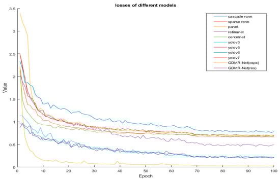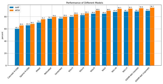 In order to verify the detection performance of the proposed GDMR-Net, this paper conducts comparative experiments on collected crop datasets, and selects two-stage deep learning algorithms Cascade R-CNN [62], Sparse R-CNN [63], PANet [36], and CenterNet [64] for comparison, and selects single-stage algorithms such as Yolov3 [38], Yolov4 [39], Yolov5 [40], YoloX [41], Yolov6 [42], and Yolov7 [12] as methods for comparison. During their training and testing processes, the data and type formats remain consistent with our proposed methods in this article. The evaluation indexes selected in this paper were AP average accuracy value and AP50 (IOU > 0.5) accuracy value. The detection results of different models are shown in Table 1.