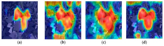 (a) The heatmap of YOLOv5 + Ghost_Convolution; (b) The heatmap of GDMR-Net + SE; (c) The heatmap of GDMR-Net + CA; (d) The heatmap of GDMR-Net + CBAM.