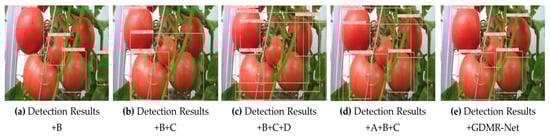 As shown in Figure 12, the red rectangular box represents ripe tomatoes. Detecting tomatoes in a greenhouse environment is often challenging when leaves and fruits overlap. We can see a missed detection of tomatoes in the detection results of (a) +B, (b) +B+C, (c) +B+C+D, and (d) +A+B+C. However, GDMR-Net shows an excellent capability for small-target detection, as show in Figure 12e. It can be clearly seen that our method has better target detection performance under full state transformation after different submodules cooperate with each other, especially for small targets and overlapping objects with better fault tolerance.