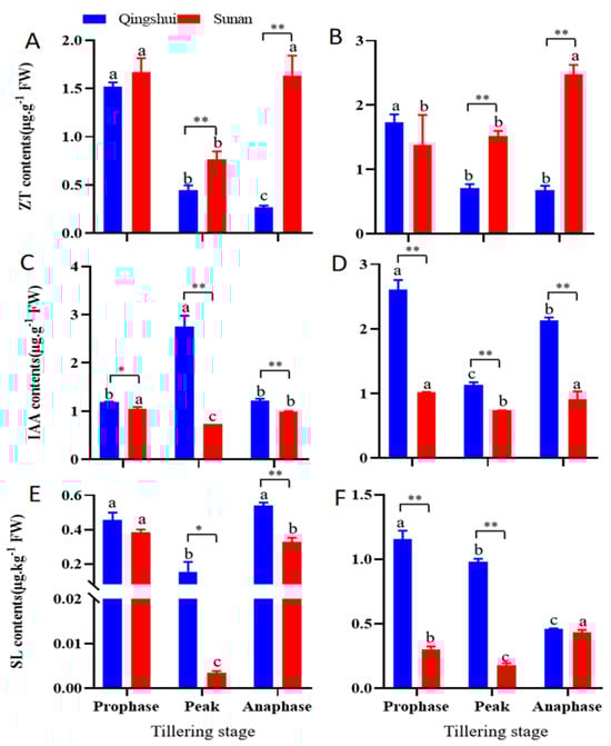 Changes in endogenous ZT, IAA, and SL during Kentucky bluegrass tillering growth period. (A,C,E): endogenous ZT, IAA, and SL in stems, (B,D,F): endogenous ZT, IAA, and SL in roots. Values are the mean ± SD. Different letters at each point (a, b, c, etc.) indicate a pairwise comparison in hormones of different germplasm at the same tillering stage by least significant difference test (p ≤ 0.05). Asterisks indicate extremely significant. “*”Indicates significant, “**” indicates extremely significant.