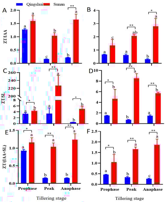 Changes in endogenous hormones ZT content and mass ratios of various hormones during Kentucky bluegrass tillering growth period. (A,C,E): endogenous ZT content and mass ratios of various hormones in stems, (B,D,F): endogenous ZT content and mass ratios of various hormones in roots. Different letters at each point (a, b, c, etc.) indicate a significant pairwise comparison by least significant difference test (p ≤ 0.05). Asterisks indicate extremely significant. “*”Indicates significant, “**” indicates extremely significant.