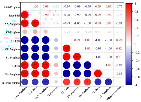 This study conducted a correlation analysis between hormone levels and tillering numbers at different tillering stages (Figure 5) and found that there was a highly significant positive correlation between IAA and SL content during the tillering stage. There is a highly significant positive correlation between the ZT content at the prophase of tillering and the ZT content at the peak and anaphase of tillering. The IAA and SL content at the anaphase of tillering and the SL content at the peak of tillering are significantly negatively correlated with tillers, and ZT content at the peak of tillering is significantly positively correlated with tillers. A correlation analysis was conducted between hormone content and tillering number in different issues (Figure S1). It was found that the IAA content in the stems was significantly negatively correlated with both ZT/IAA and ZT/(IAA+SL) content in the stems, as well as with the ZT, ZT/SL, ZT/(IAA+SL) content in the roots, and significantly positively correlated with the SL content in the roots. The IAA content in the roots is significantly positively correlated with the SL content in the stems and roots, and significantly negatively correlated with the ZT/IAA, ZT/SL, and ZT/(IAA+SL) content in the roots.