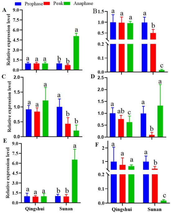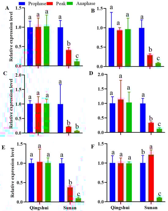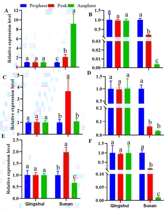 At prophase, the expression trends of SL-related genes D14-like, D14.1-like, and D14 in different stages of Qingshui and Sunan materials are basically consistent (Figure 8). Throughout tillering D14-like and D14.1-like were not expressed in the Qingshui material, but in the Sunan material, their expression was downregulated in the stems and roots at the peak and anaphase of tillering. Similarly, D14 gene expression was downregulated at the peak and anaphase of tillering in stems but upregulated at the peak and downregulated at the anaphase of tillering in roots. When comparing the two materials, the D14-like gene was upregulated in the stems of Sunan at the prophase and peak of tillering and downregulated at the anaphase of tillering. The D14.1-like gene is upregulated at the prophase, almost not expressed at the peak and anaphase of tillering. The D14 gene is upregulated. In the Sunan roots, the D14-like gene was upregulated at the prophase and downregulated at the peak and anaphase of tillering. Similarly, D14.1-like gene expression is upregulated in Sunan at the prophase and downregulated at the peak and anaphase of tillering. The D14 gene is almost not expressed at the prophase, upregulated at the peak of tillering, but downregulated at the anaphase of tillering (Figure S4).