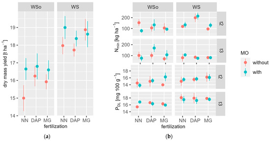 (a) Maize dry mass yield (t ha−1) on the “Wanna Sand without biogas slurry” (WSo) and “Wanna Sand” (WS) sites in 2021. (b) Concentrations of mineral nitrogen (Nmin) and plant-available phosphorous (PDL) in the soil at the sampling dates t2 (June) and t3 (July). MO—application of a combined inoculum containing three species of AMF and B. atrophaeus; NN—no starter fertilizer; DAP—starter fertilization with diammonium phosphate; MG—starter fertilization with organomineral microgranular fertilizer. The values are depicted as the mean and 95% confidence interval.