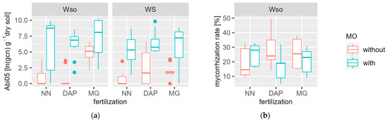 Additionally, at the WSo site, the Abi05 abundance was influenced by the starter fertilizer (p = 0.046). Plots fertilized with MG harbored significantly more Abi05 bacteria than the plots fertilized with DAP (p = 0.004) and without fertilization (p = 0.044). This was observed regardless of inoculation with Abi05, meaning that fertilization with MG increased Abi05 abundance in non-inoculated plots (Figure 2a).
