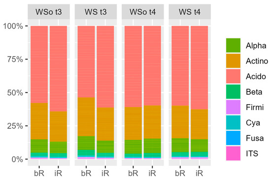 Soil microbial community composition in the “Wanna Sand without biogas slurry” (WSo) and “Wanna Sand” (WS) sites at the sampling dates t3 (July) and t4 (August), bR—between the maize rows (outside the application area of starter fertilizers and MO), iR—in the rows (inside the application area of starter fertilizers and MO); the quantified groups were: Acido—Acidobacteria, Actino—Actinobacteria, Alpha—α-Proteobacteria, Beta—β-Proteobacteria, Cya—Cyanobacteria, Fusa—Fusaria, Firmi—Firmicutes, ITS—total fungi.