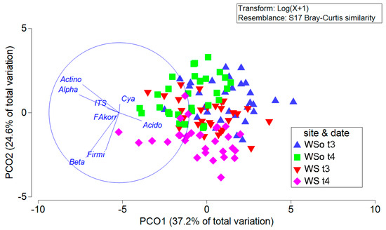 The differentiation between the sites mainly occurs along the PCO2 axis. The microbial groups driving the differentiation between the sites were β-Proteobacteria and Firmicutes (Figure 3). The relative abundance of Fusaria and total fungi also significantly differed between the sites (Table 3), which is not shown by the PCO due to their low overall abundance. All studied microbial groups except for Fusaria exhibited a significant influence from the sampling date and/or the interaction between the site and sampling date (Table 3). The differentiation of sampling dates took place along the PCO2 axis at the WS site and along the PCO1 axis at the WSo site. This indicates that, at the WS site, Firmicutes and β-Proteobacteria were important drivers for the differences between the sampling dates, while at the WSo site, Actinobacteria, α-Proteobacteria, and Acidobacteria were more important. A detailed view of the differences in the relative abundance of all studied microbial groups between sites and sampling dates is provided in the Supplemental Material (Figure S5).