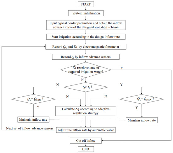 Flowchart of the adaptive border irrigation process. Qc is the actual inflow rate (L s−1); QMIN is the minimum inflow rate set in the border irrigation system (L s−1); QMAX is the maximum inflow rate set in the border irrigation system (L s−1); VA is the volume of accumulated irrigation (m3); tA is the actual water inflow advance time (s); tE is the expected water inflow advance time (s).